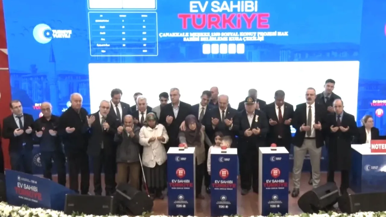 Konut projesine Çanakkale merkez başta olmak üzere Ayvacık, Biga, Çan, Ezine, Gelibolu ve Yenice ilçelerinde toplam 29 bin 800 vatandaşın başvuruda bulunduğunu bildiren Kuşçu, "Noterimizin huzurunda, sizlerin huzurunda bu talepler için 3 bin 276 ailemizi belirleyeceğiz. Hak sahibi olacak vatandaşlarımıza şimdiden hayırlı olmasını diler, sağlık, huzur ve güven içerisinde yaşayacakları sıcak yuvalar inşa edeceğimizi müjdelemek isterim." ifadelerini kullandı. İl Müftüsü Mustafa Bilgiç'in yaptığı duanın ardından başlanan kura çekimiyle 3 bin 276 hak sahibi belirlendi.