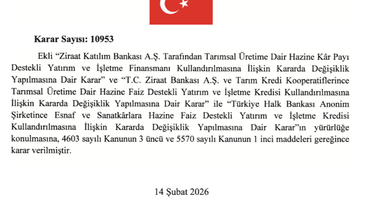 15 Şubat 2026 tarihli ve 33169 sayılı Resmî Gazete’de yayımlanan 10953 sayılı Cumhurbaşkanı Kararı ile tarımsal üretim finansmanında devrim niteliğinde bir değişikliğe gidildi. Yapılan düzenleme ile Ziraat Bankası, Ziraat Katılım ve Tarım Kredi Kooperatifleri üzerinden kullandırılan Hazine destekli kredilerde borç engeli büyük oranda ortadan kalktı.